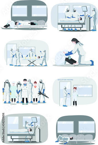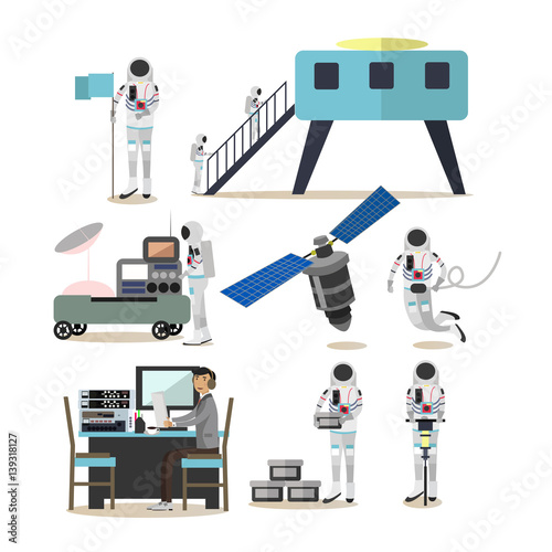 Vector set of space exploration concept design elements isolated on white background. Mission control center personnel, astronauts, satellite, space base and space rover in flat style.