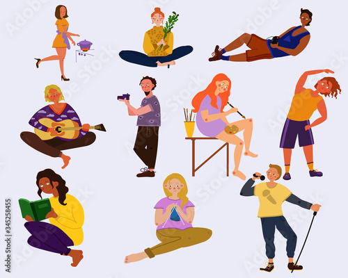 Vector set of sport people competing isolated on white background. Bobsleigh, long and high jumping, running, diving, synchronized swimming, water polo, biathlon design elements, icons in flat style.