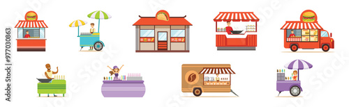 Vector set of store buildings. Shops design elements and icons in flat style isolated on white background. Coffee shop, bakery, grocery store, ice cream.