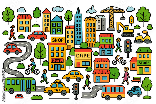 Vector set of street traffic concept design elements in flat style. People crossing street, hailing taxi, walking dogs, shopping walking with baby, waiting for bus.