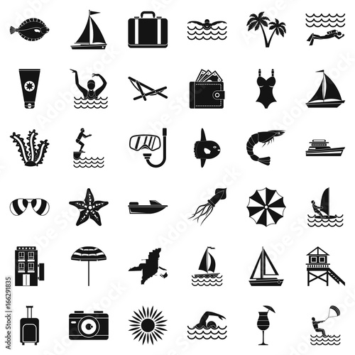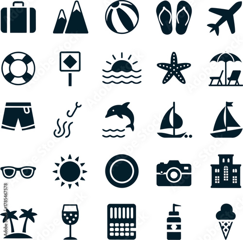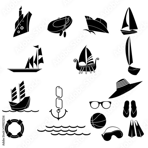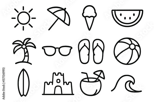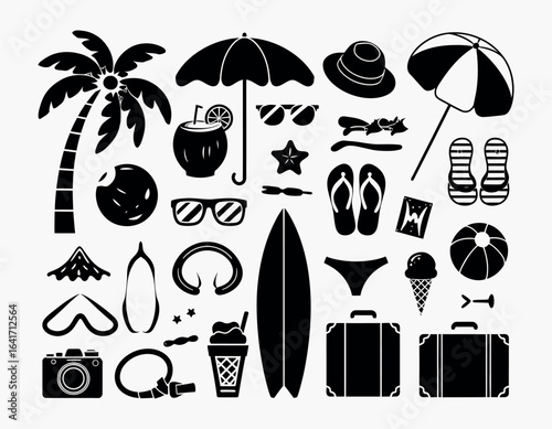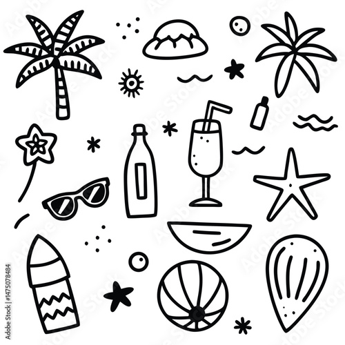 Vector set of summer season objects in vintage style. Design elements, icons isolated on white background. Summer camp, beach holidays, tropical sea vacations. - stock vector