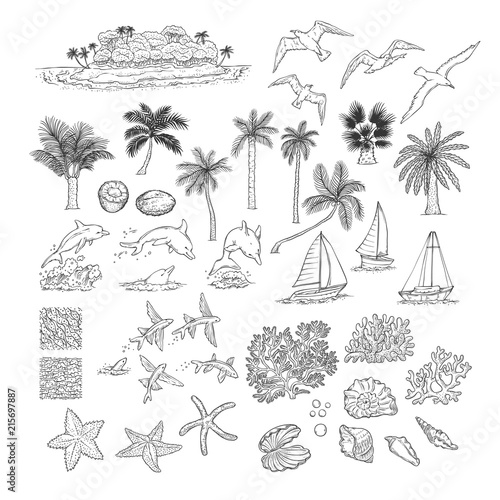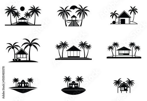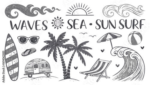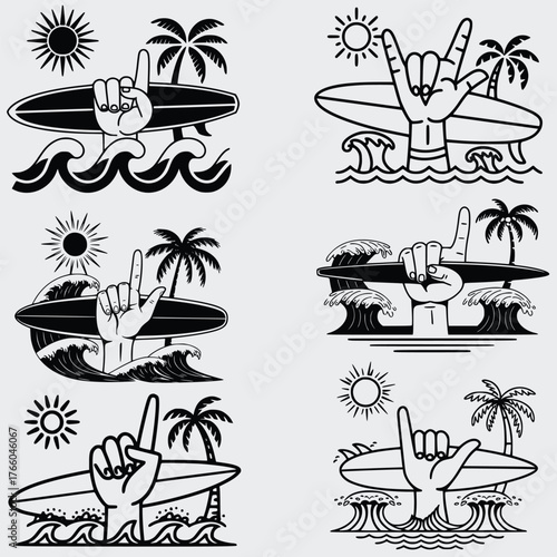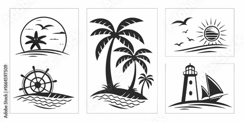 Vector set of summer adventure, beach vacation, night party, surfing vintage logos, emblems, labels and badges. Black and white monochrome illustration in retro style.