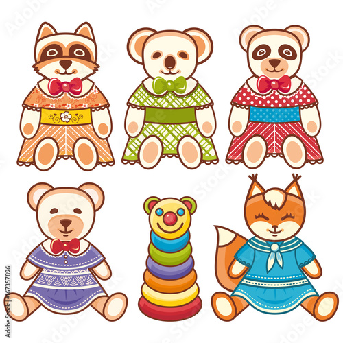 Vector set of Kolobok, The Bun russian folk fairy tale for kids characters. Flat style design elements, icons, stamps.