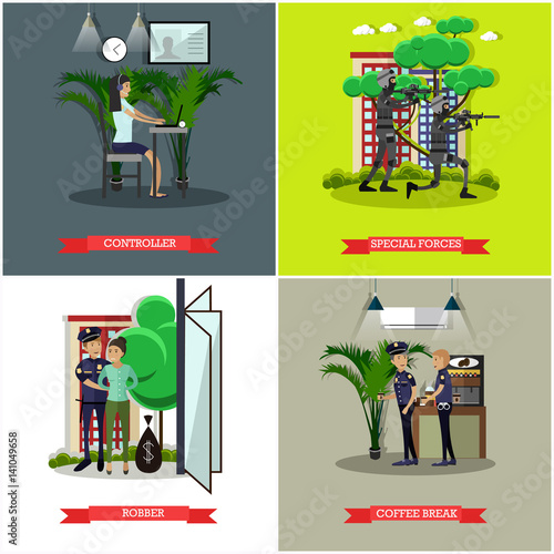 Vector set of tourist posters, banners. Tourist, Zoo, Departure and Souvenirs concept flat style design elements.