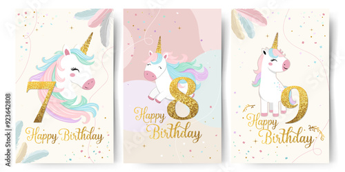 Magic unicorn cards. Vector hand drawn illustration. Greeting, invitation card templates for kids with romantic mythical creature unicorn, rainbows, clouds, hearts and handwritten text.