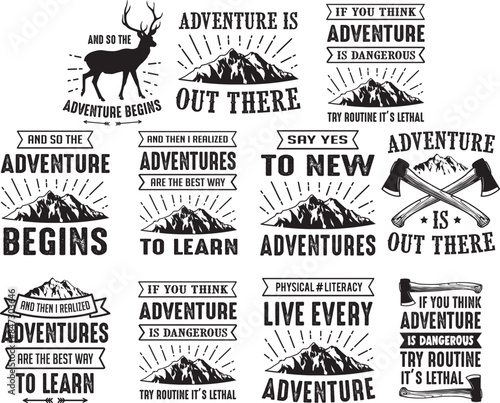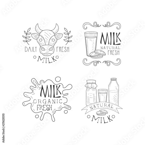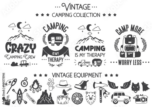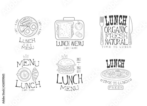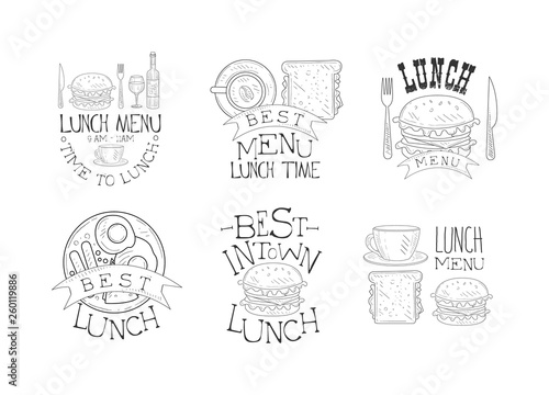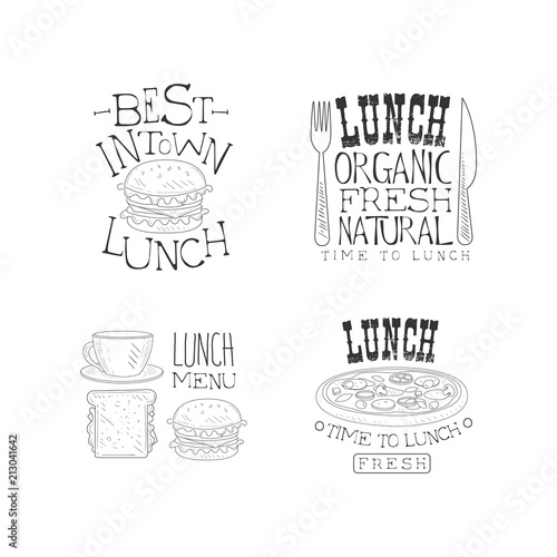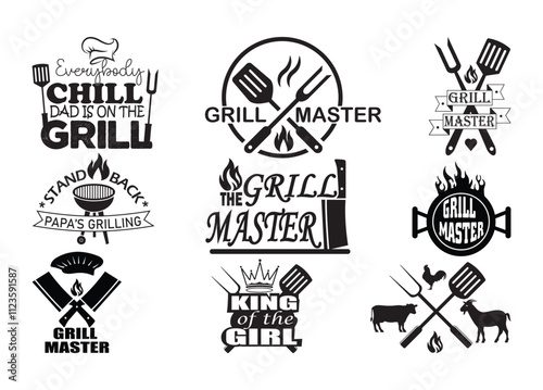 Grill label, emblem, logo and badge set, vector illustration. Grilled steak, roasted pork, meat quotes hand lettering vintage typography for steak house restaurant snack grill bar menu barbecue party.