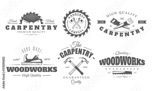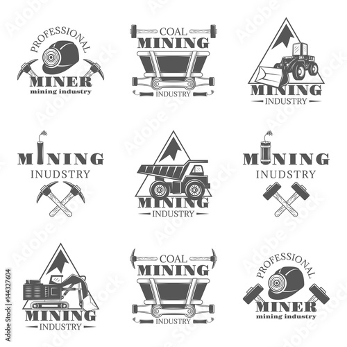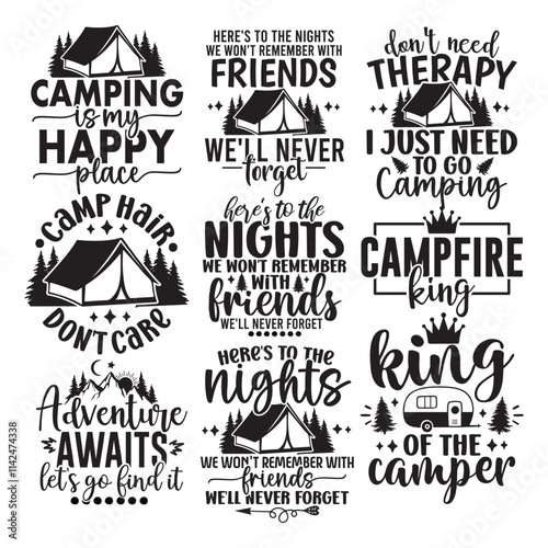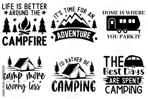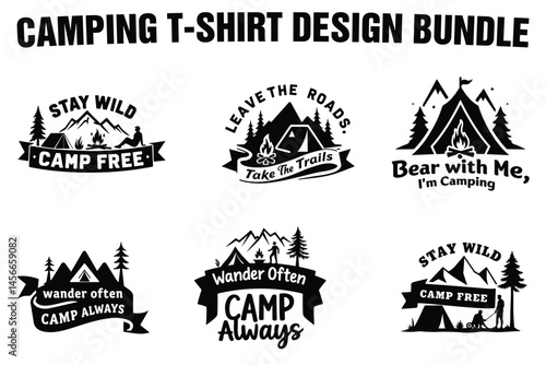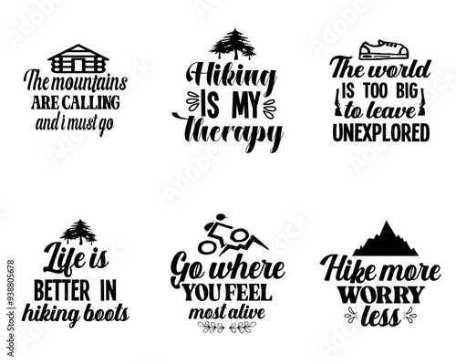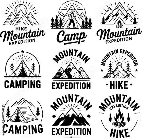 Outdoor label, emblem, badge and logo set, vector monochrome illustration in vintage style. Mountain expedition, journey adventures, camping, mountain trips, kayak tours, forest camp lettering.