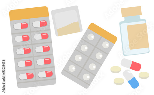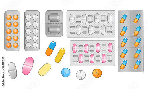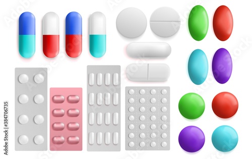 Vector set of vitamin pill and tablet 3d models isolated on white background. Medicine and medical drugs illustration. Mockup and realistic template for drugs blister. Colorful antibiotic pills.