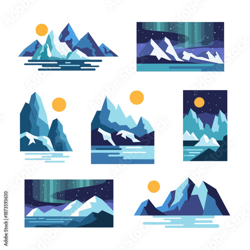 Vector set of wild north posters, banners. Polar bear, Penguins, Tambourine and Bonfire design elements in flat style.
