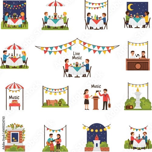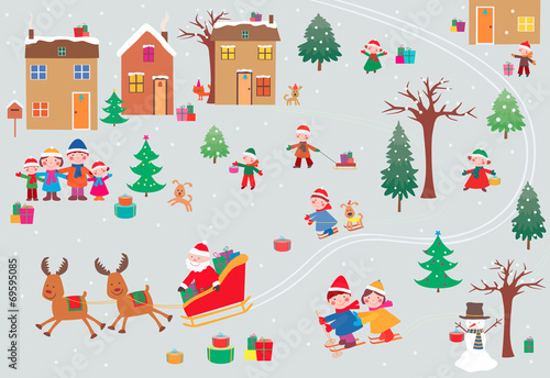 Vector set of winter people activities concept design elements in flat style. Characters sledding, playing snowballs, making snowman and snow angel, clearing car from snow, shopping. Winter cityscape.