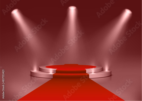 Spotlights and white round stage podium with red carpet. Vector realistic illustration. Red carpet event design element.