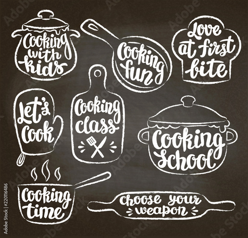 Vector tea set with handwritten inspirational and funny tea quotes and sayings. Vintage creative white on chalkboard typography design for tea room and print.