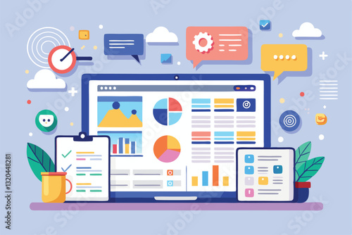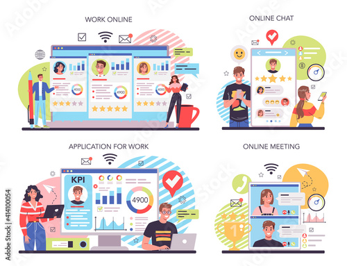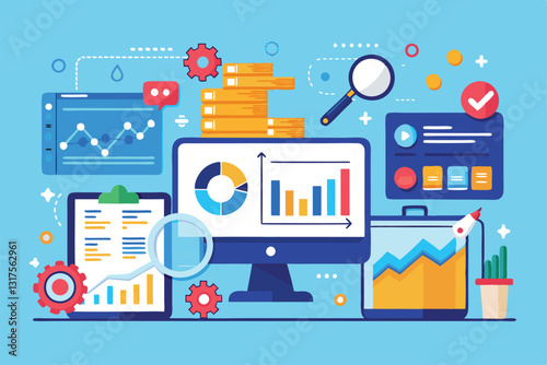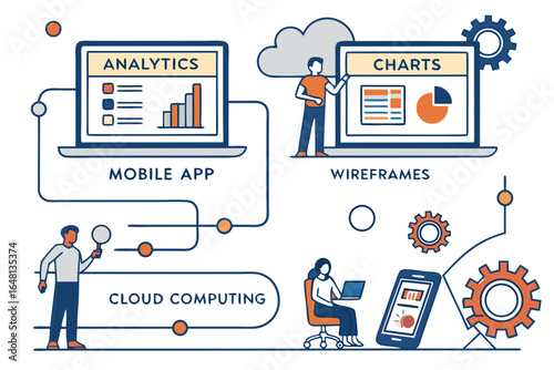 Business analytics poster banner template. Vector thin line art flat style design with office workers funny cartoon characters, business symbols, icons for website banners and printed materials.