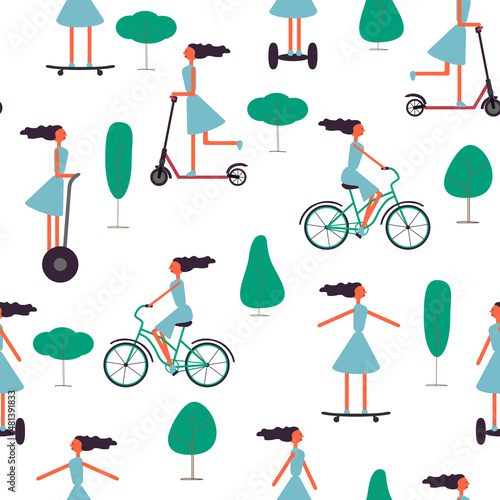 Vector seamless pattern with bike, exercise bicycle, race cycling gear and clothing. Thin line art flat style design bicycle background, wallpaper.