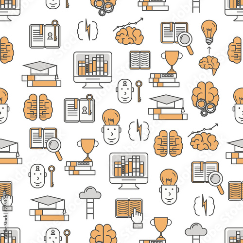 Vector seamless pattern with brain training, brainstorming, innovation, creative thinking symbols, icons. Thin line art flat style design brain background, wallpaper.