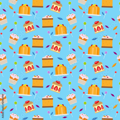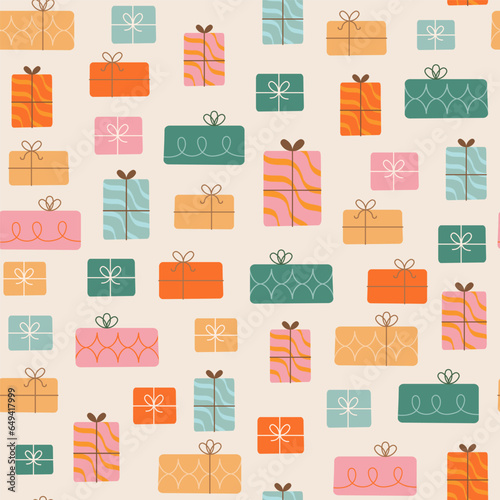 Vector seamless pattern with Easter basket, cake, eggs, bunny, church, bible, gift box, glass of wine, candles etc. Thin line art flat style design Easter background, wallpaper.