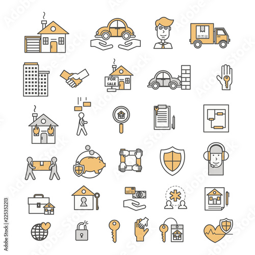 Life, health, property, deposit insurance icon set. Vector thin line art flat style design elements, symbols isolated on white background.