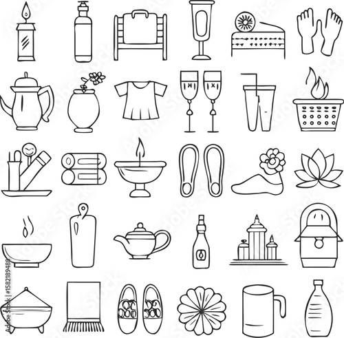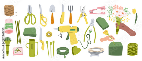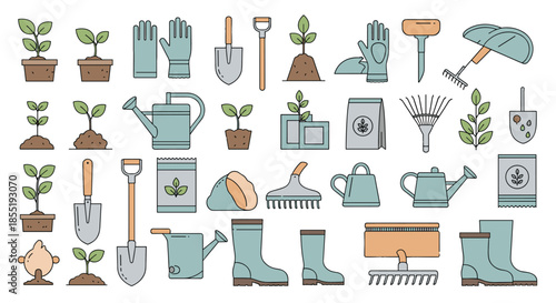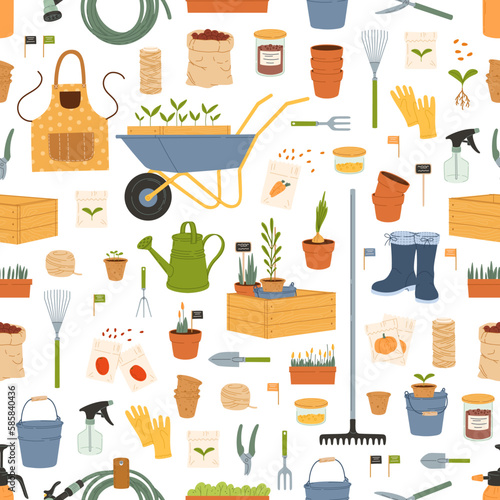 Vector seamless pattern with garden tools, equipment and clothing. Thin line art flat style design gardening background, wallpaper.