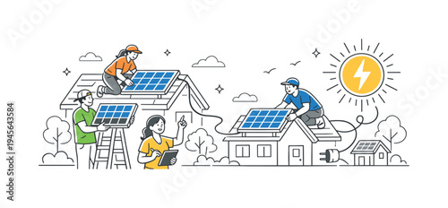 Innovations advertising poster banner template. Wind and solar panel energy, chemistry innovations etc. vector thin line art flat style design elements, icons for web banners and printed materials.