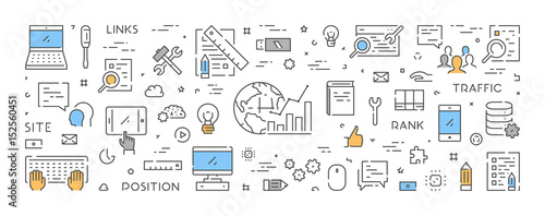 Mobile banking advertising poster banner template. Online shopping, e-commerce, mobile payment symbols. Vector thin line art flat style design elements, icons for website banners and printed materials