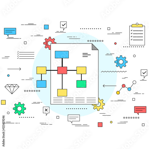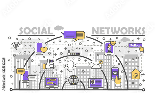 Social networks poster banner template. Social media, online chat, email communication symbols. Vector thin line art flat style design elements, icons for website banners and printed materials.