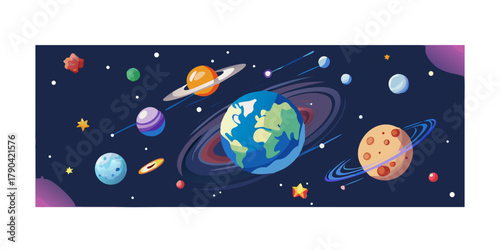 Space vector web banner template set. Space items rocket, planets, spaceship, telescope, astronaut, Big Dipper constellation etc. Cosmos thin line art flat style design elements, icons, copy space.