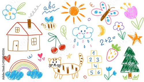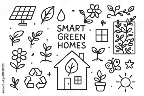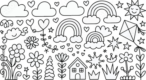 Sun shaped poster banner template. Spring flowers, gardening tools and clothes, other spring symbols. Vector thin line art flat style design elements, icons for website banners and printed materials.