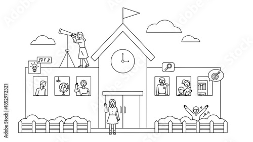 University poster banner template. Student, owl, graduation hat, diploma, cup and other educational symbols vector thin line art flat style design elements icons for web banners and printed materials.