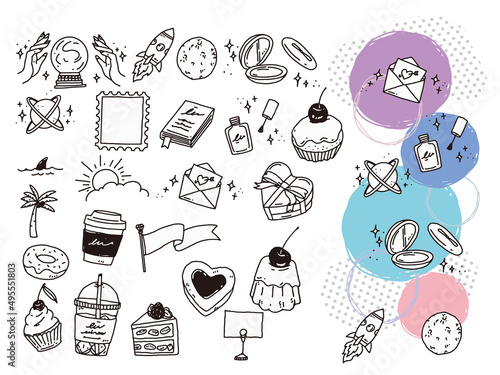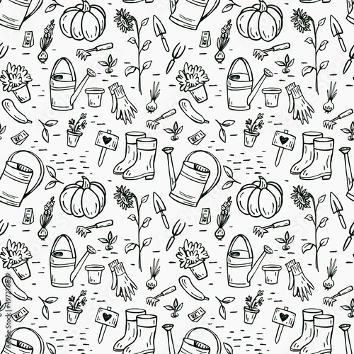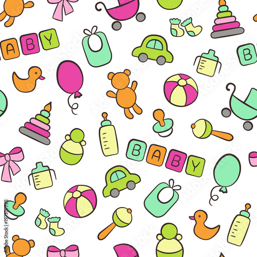Vector seamless pattern with bear, elephant, zebra, parrot, lion, ice cream cone, bus, camera, visitors, animal food and cotton candy. Thin line art flat style design zoo background, wallpaper.