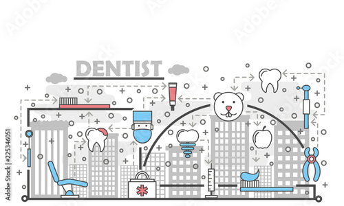 Dentist poster banner template. Tooth, implant, toothpaste, toothbrush, dental equipment. Vector thin line art flat style design elements, icons for website banner, printed materials.