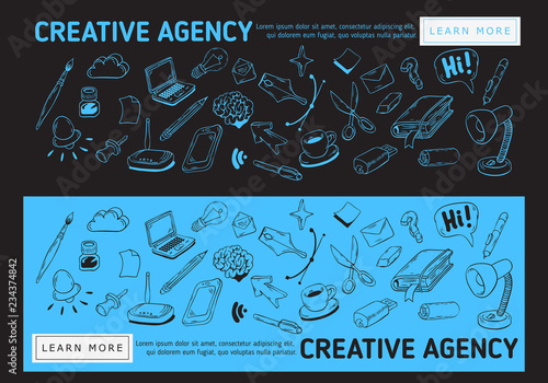 Vector web banner template set with engineering measuring tools and equipment, copy space. Geometric, Engineer, Devices concept thin line art flat style design elements.