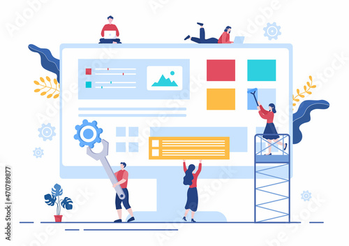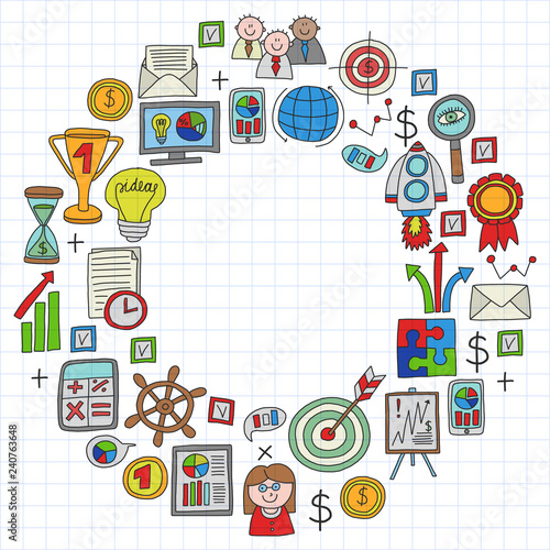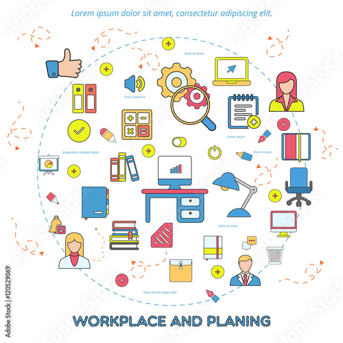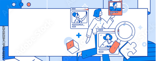 Business teamwork poster banner template. Vector thin line art flat style design with office workers funny cartoon characters, business symbols, icons for website banners and printed materials.