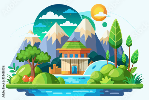 Vector tourist interior poster, banner set with camping site, zoo area with wild animals and exotic birds, airport terminal. Flat style design.
