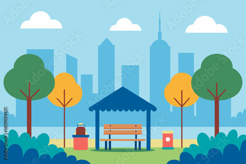 Vector tourist interior poster, banner set with city street, taxi stand, street food kiosk, camping site, gift shop. Flat style design.