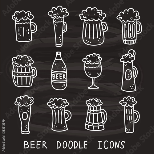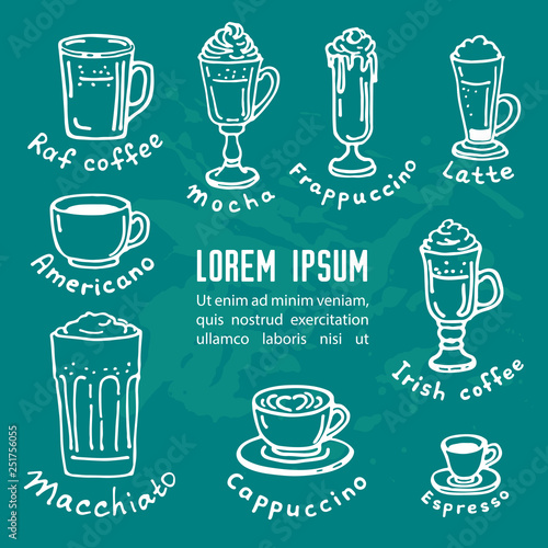Coffee set, vector hand drawn illustration. Vintage white coffee mug, cup, pot and coffee maker on black background for restaurant or cafe menu, poster, banner.