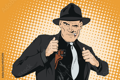 Vector illustration of man showing stop hand sign, stop gesture in retro pop art comic style.