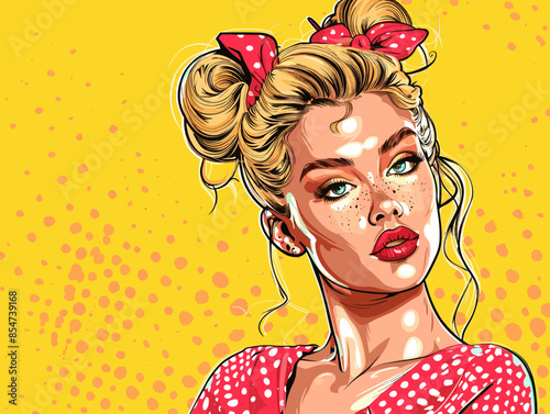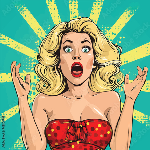 Vector illustration of surprised blonde woman and sale lettering. Discounts and sales advertising poster in retro pop art comic style.