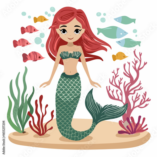 Vector illustration of beautiful young woman holding pearl shell. Smiling summer girl in retro pop art comic style.
