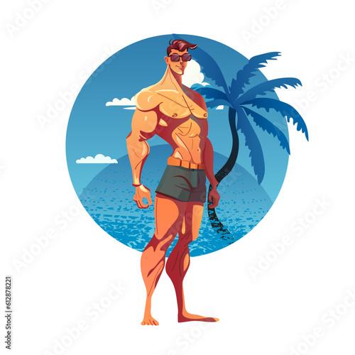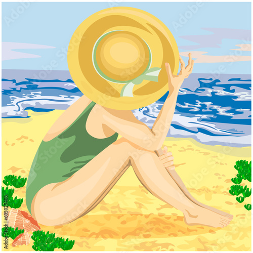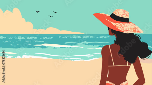 Vector illustration of woman in swimsuit and sun hat relaxing at the seaside. Beach holidays template in retro pop art comic style.