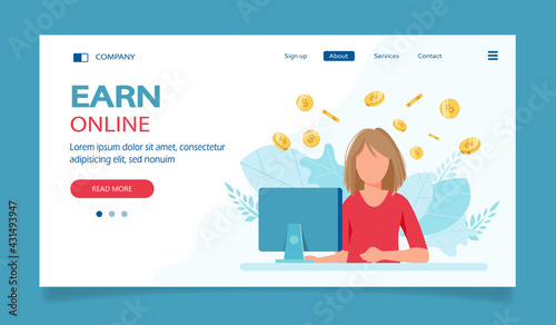 Vector web site linear art design template. Business partnership concept. Businessmen cut a deal with finance charts on background. Landing page for website and mobile development.