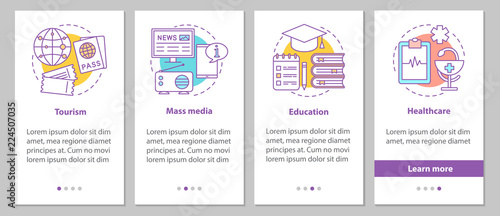 Vector web site linear art onboarding screens template. Online digital marketing, web and video advertisement. Email marketing and spam. Menu banners for website and mobile app development.