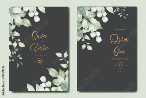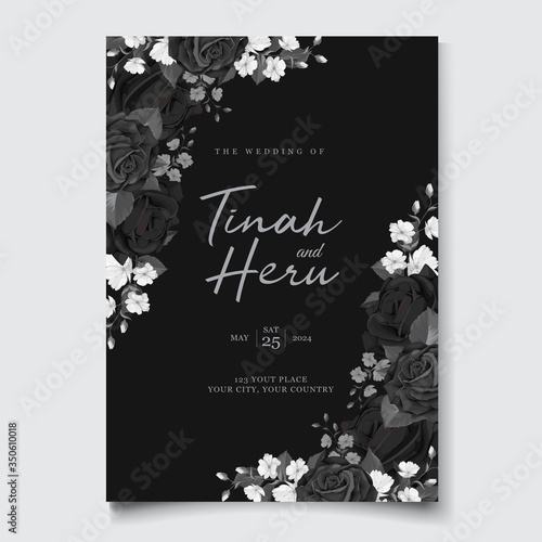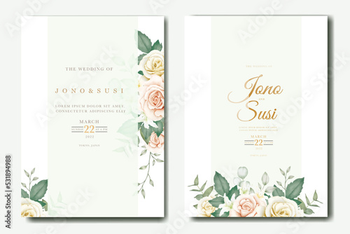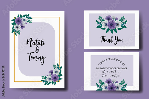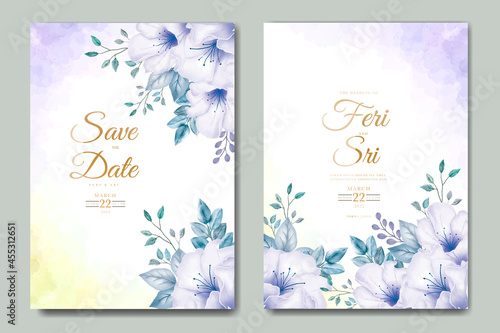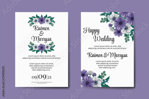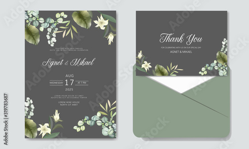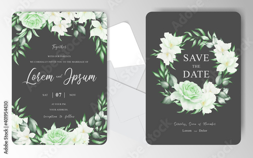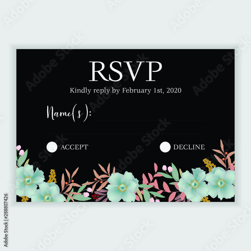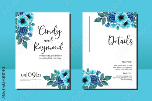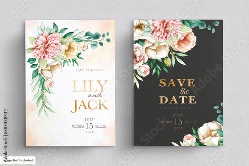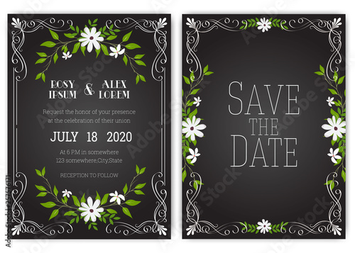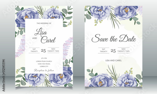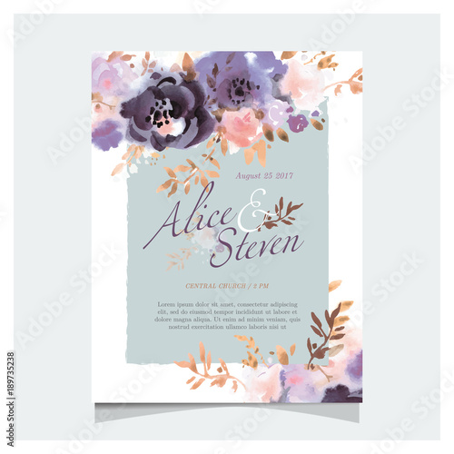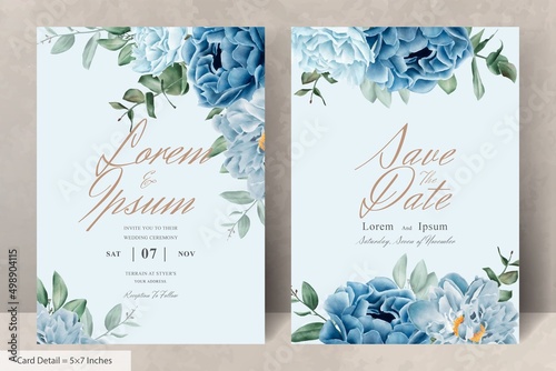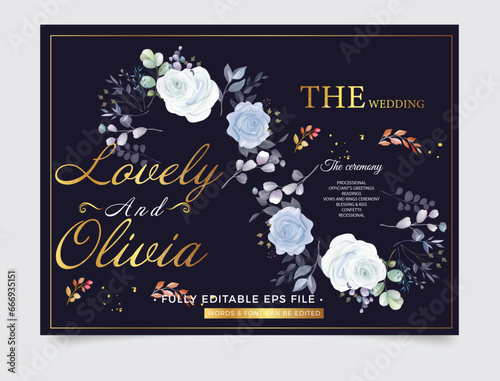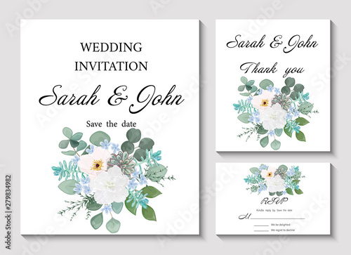 Vector illustration of wedding invitation, greeting card with white peony and forget-me-not flowers. Set of isolated basic parts of plant bud, flower, stem and leaf.