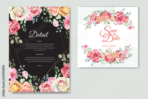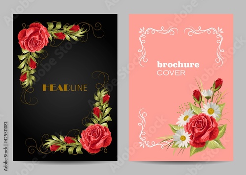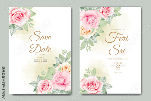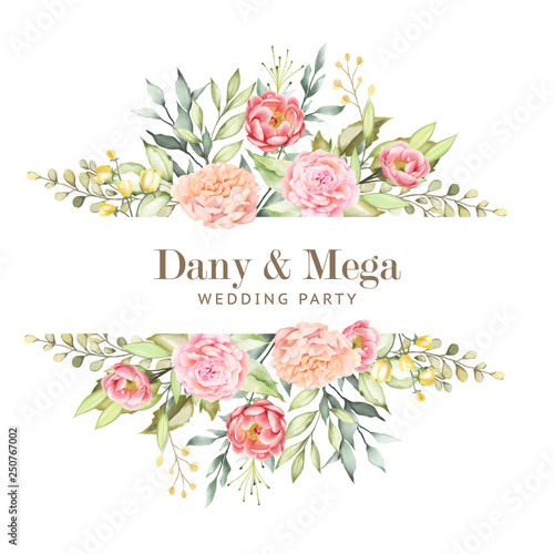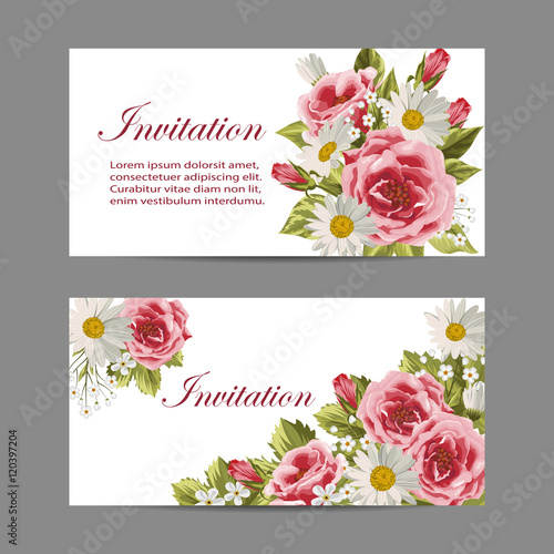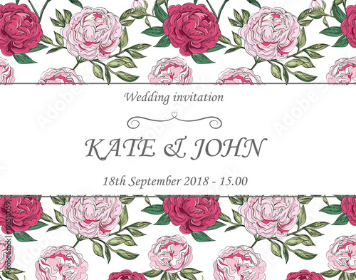 Vector illustration of wedding invitation, greeting card with peony flowers. Set of isolated basic parts of peony plant bud, flower, stem and leaf.
