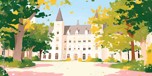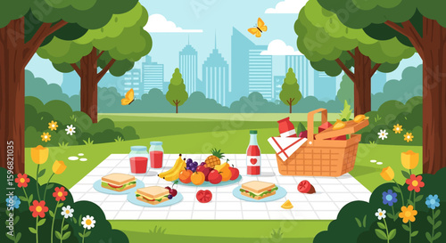 Vector seasonal work in city park illustration. Man worker character caring grass and plant, trimming, cutting and landscaping cartoon background. Volunteer community gardening in urban area