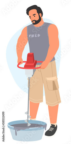Vector worker making cement. Builder in uniform mixing portion with construction mixer in stainless steel bowl illustration isolated on white background. Tile master at work concept