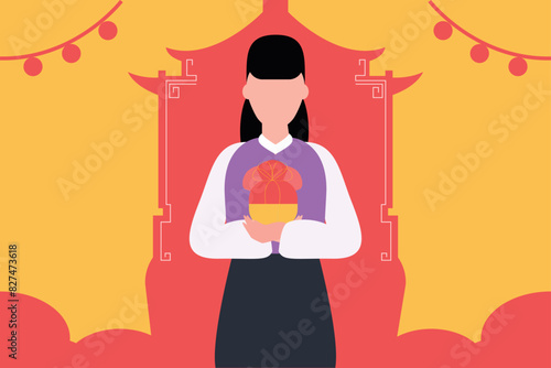 Vector young woman with sunburn problem standing under sun cartoon illustration. Girl applying protective cream to treat damaged skin