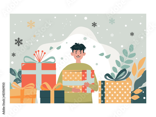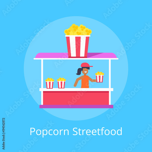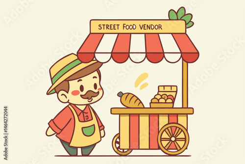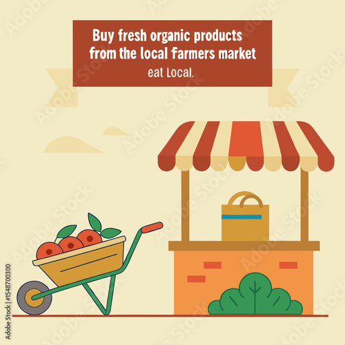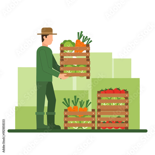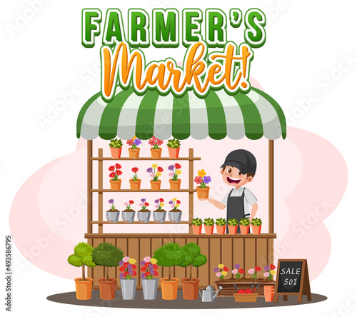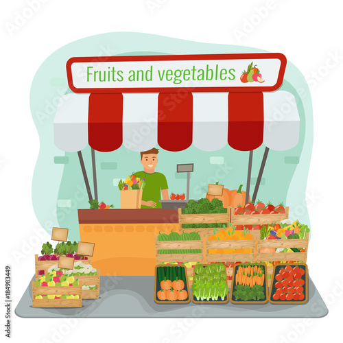 Vector illustration of saleswoman standing at market stall with vegetables. Flat style design.