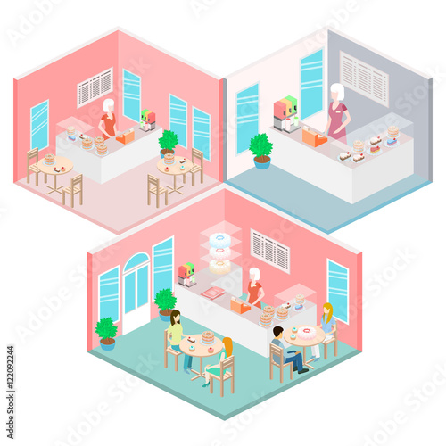 Veterinary clinic cutaway interior, vector flat isometric illustration. Vet clinic with furniture, veterinary equipment and supplies, veterinarians and clients with their pets.