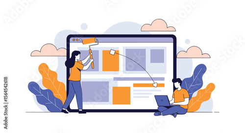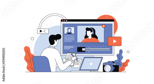 Video lesson, vector flat style design illustration. Big tablet with teacher on screen, tiny characters. Online education, e-learning, online training concept for web banner, website page etc.
