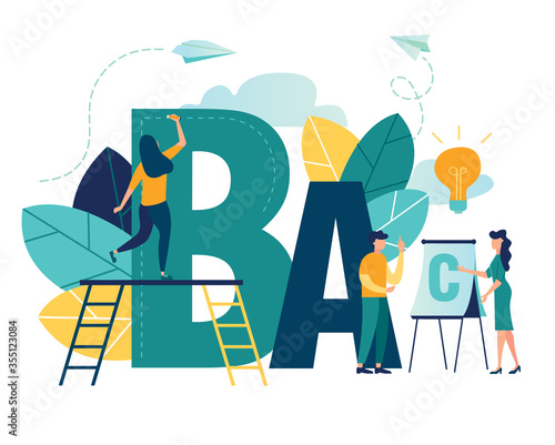 Huge professional video camera and micro characters film crew shooting movie, vector flat illustration. Videographer, director, girl with clapperboard making film. Cinema industry, movie production.